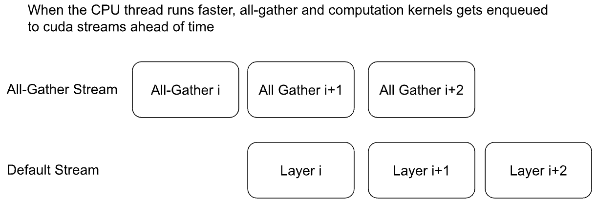 CPU 密集型工作負載:如果使用隱式預取,當層 i 的核心執行時,CPU 執行緒將太慢而無法發出層 i+1 的 all-gather。我們必須在執行層 i 的前向計算之前顯式發出 all-gather i+1。