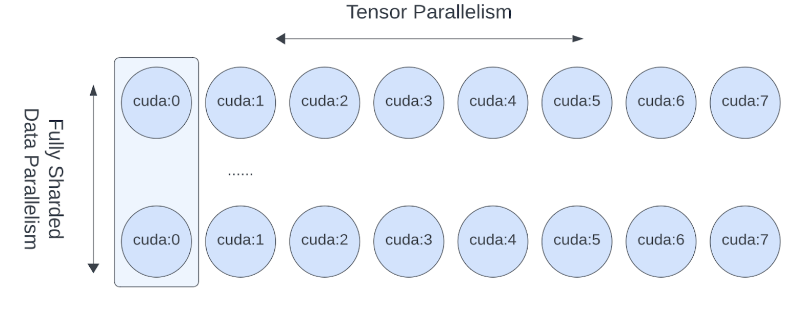 這將使我們能夠在每個主機內部(主機內)輕鬆應用張量並行,並在主機之間(主機間)應用 FSDP,並且 Llama 模型 **無需更改任何程式碼**。張量(模型)並行和資料並行技術相結合,能夠透過大量 GPU 繼續增加模型大小並高效地進行訓練。