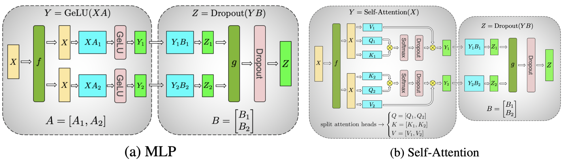 圖 1. 在 Transformer 模型的 MLP 和自注意力層上表示張量並行風格的分片,其中注意力/MLP 中的矩陣乘法透過分片計算完成(圖片來源)#