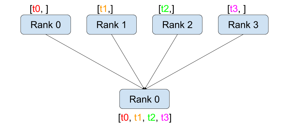 dist.broadcast(tensor, src, group):將tensor從src複製到所有其他程序。dist.reduce(tensor, dst, op, group):將op應用於每個tensor,並將結果儲存在dst中。dist.all_reduce(tensor, op, group):與 reduce 相同,但結果儲存在所有程序中。dist.scatter(tensor, scatter_list, src, group):將 \(i^{\text{th}}\) 個張量scatter_list[i]複製到 \(i^{\text{th}}\) 個程序。dist.gather(tensor, gather_list, dst, group):將來自所有程序的tensor複製到dst。dist.all_gather(tensor_list, tensor, group):將所有程序的tensor複製到所有程序的tensor_list中。dist.barrier(group):阻塞 group 中的所有程序,直到每個程序都進入此函式。dist.all_to_all(output_tensor_list, input_tensor_list, group):將輸入張量列表分散到組中的所有程序,並在輸出列表中返回收集的張量列表。